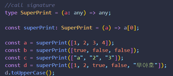 예를 들어 d.toUpperCase()를 사용하게 되면 에러가 난다. 왜냐면 superPrint는 배열의 첫 번째 요소를 리턴해주는데 d의 첫번째 요소는 number이다. 안타깝지만 숫자는 대문자가 없거든요. 아무튼 any 웬만하면 쓰지 말란 말이야~~