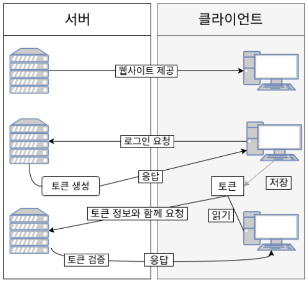 - 클라이언트는 서버 측에서 전달받은 토큰을 쿠키나 스토리지에 저장해 두고, 서버에 요청을 할 때마다 해당 토큰을 HTTP 요청 헤더에 포함시켜 전달합니다.
